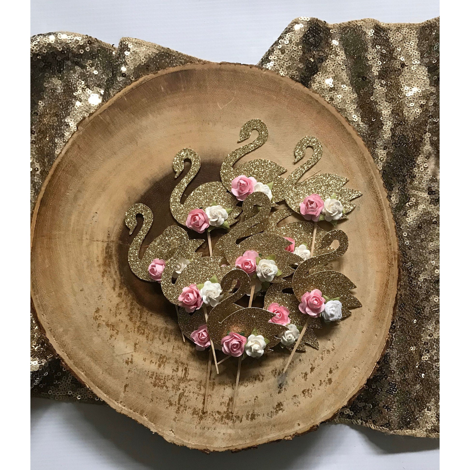 This listing is for 6 Toppers made out of glitter cardstock. Backs are white and pick is exposed. Flowers will always be pink and white. Choose your color Swan from the drop down menu.